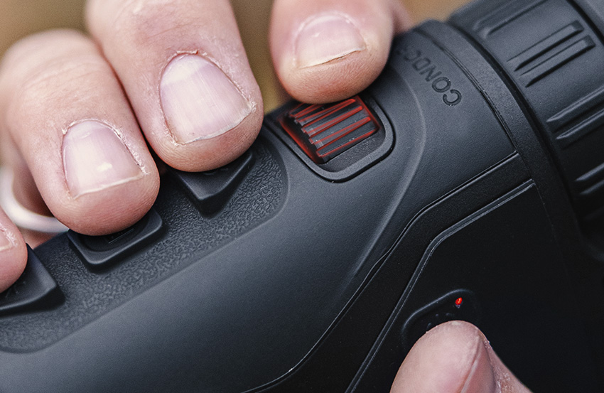 Enfocar con el monocular térmico CONDOR LRF 2.0 se puede hacer fácilmente con un solo dedo. Con la rueda trasera de enfoque al alcance, el cazador puede ajustar el enfoque rápidamente durante la observación, cambiando entre animales cercanos y distantes. Tienes el control de la visión térmica.
