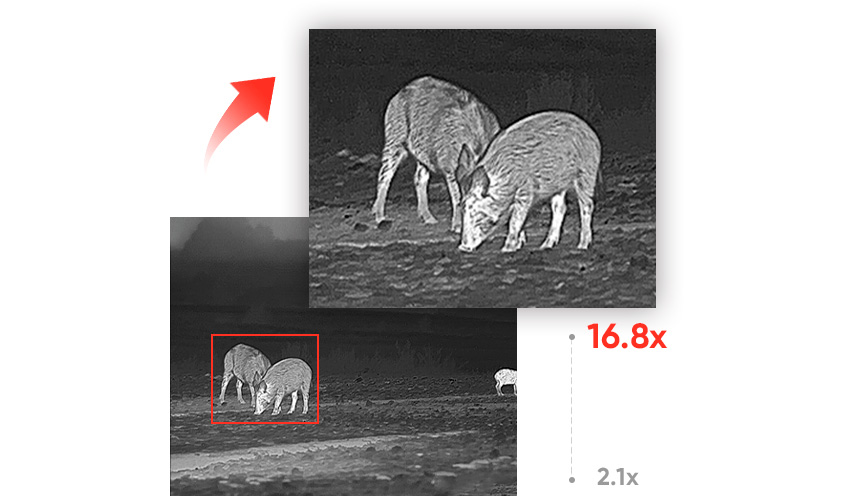 Adecuado para diferentes escenas de observación, brindando una ventaja considerable al acechar de noche a largas distancias desde un escondite elevado en un campo, o brindando una visión general perfecta en un área boscosa a distancias cortas.