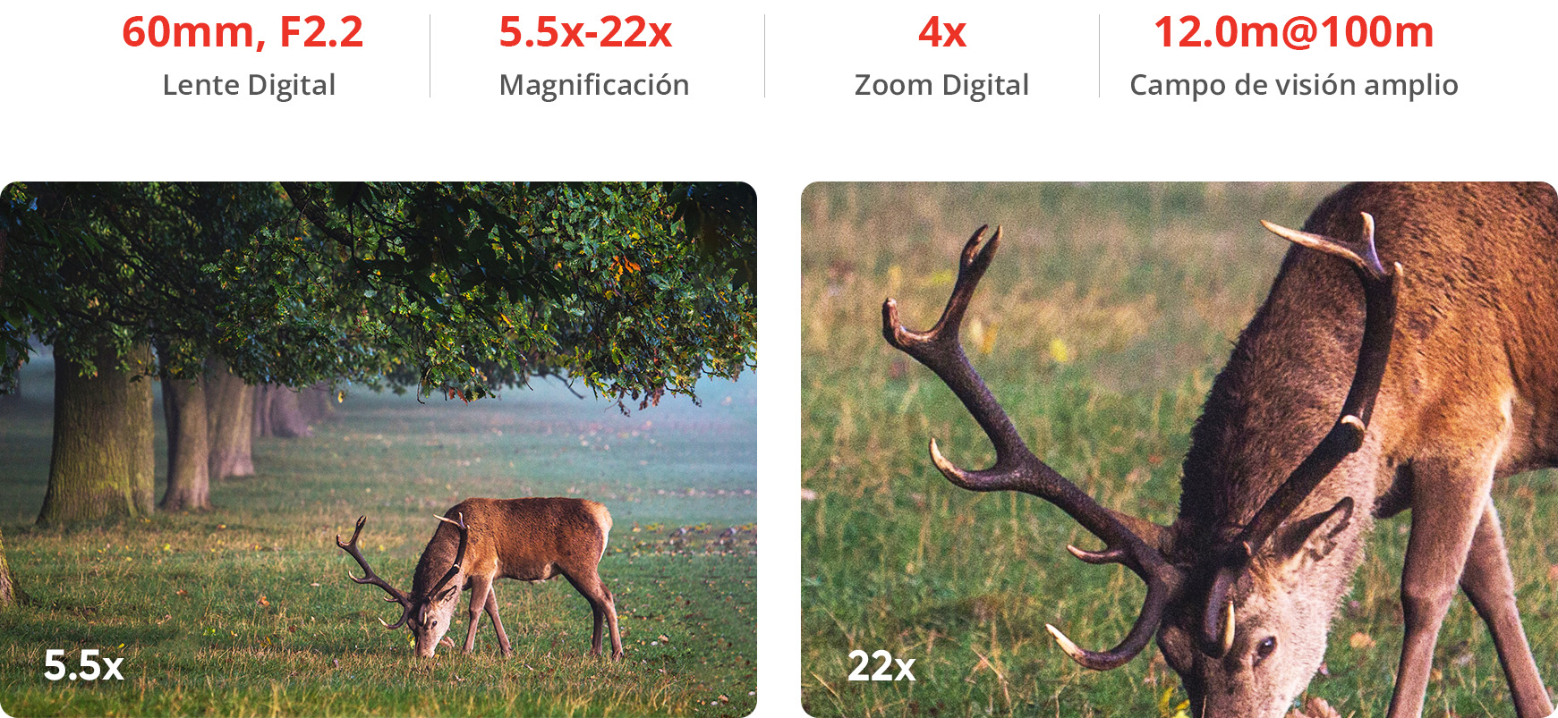En lugar de un aumento fijo con binoculares ópticos, el aumento de 5,5x-22x con una distancia focal de 60 mm significa que puede acercar y alejar el HABROK 4K con total libertad, desde capturar entornos completos hasta reconocer los detalles más pequeños, como la cornamenta de un ciervo o el sexo del animal, en un radio de 150 m durante el día.