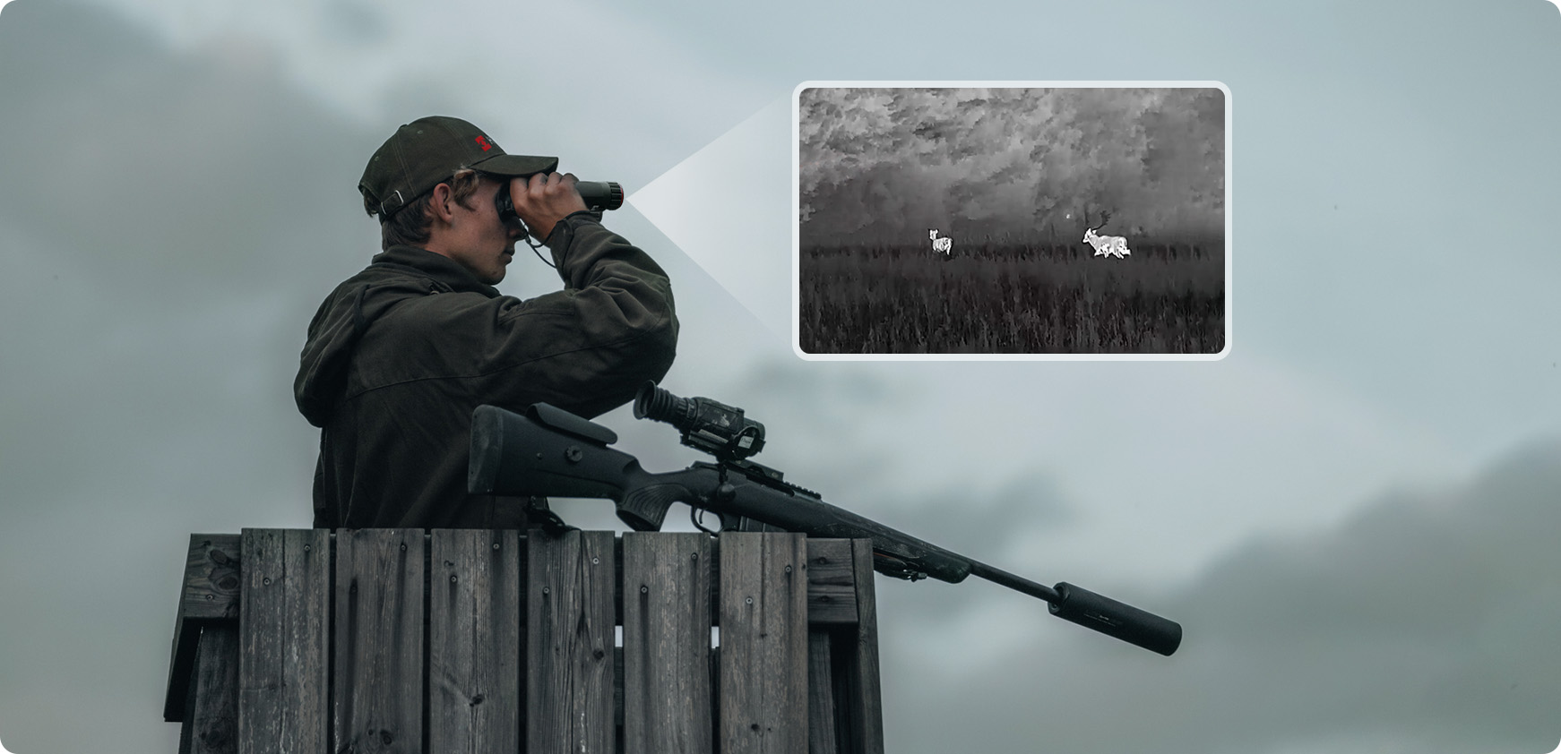 Como binocular multiespectral, la cámara térmica del HABROK 4K permite ver a través del camuflaje de los animales y presentar su señal térmica incluso cuando se encuentra entre arbustos u hojas, lo que permite un escaneo rápido y una búsqueda eficiente en plena naturaleza. Además, con una cámara térmica de hasta 640×512 y 20 mK, el HABROK 4K puede capturar tanto la presa como el entorno sin perder detalle.